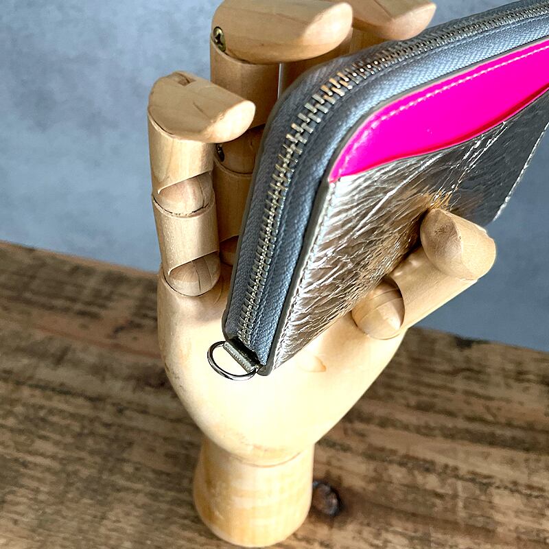 ファスナーの先端にDカンをつけました。チェーンをつけてショルダーやバッグにジョイントさせることも可能です。可愛いチャームをつけてもいいですね。